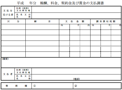 「支払調書」は、通常二枚作成し、一枚は税務署へ提出し、一枚を支払った相手に渡します。期間中に、支払った報酬や賞金などを含め、合計5万円を超える(5万円までは提出が不要です)報酬額の合計、源泉徴収をした金額の合計を記入します。